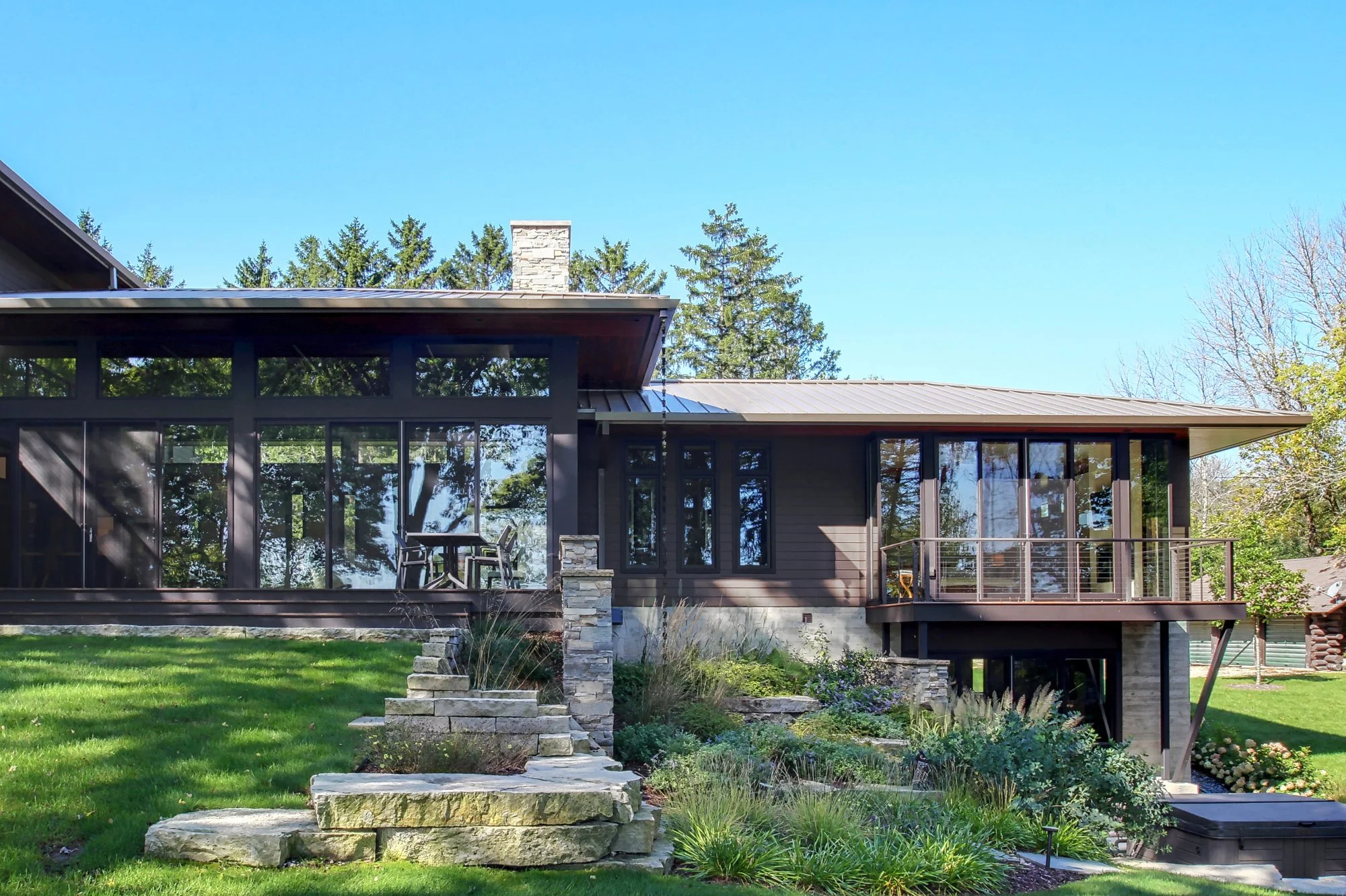 The site is located on the top of a bluff along Lake Michigan. The design reflects the client’s wish for a ‘modern’ prairie style home, and is oriented lengthwise along the lake with views from all major rooms. The natural slope of the site down towards the north allowed for a partially exposed lower level, as well as a bridge as part of the entry sequence. The use of board-formed concrete, silvery stone walls, and wood surfaces form a natural material palette suitable for the secluded picturesque surroundings.